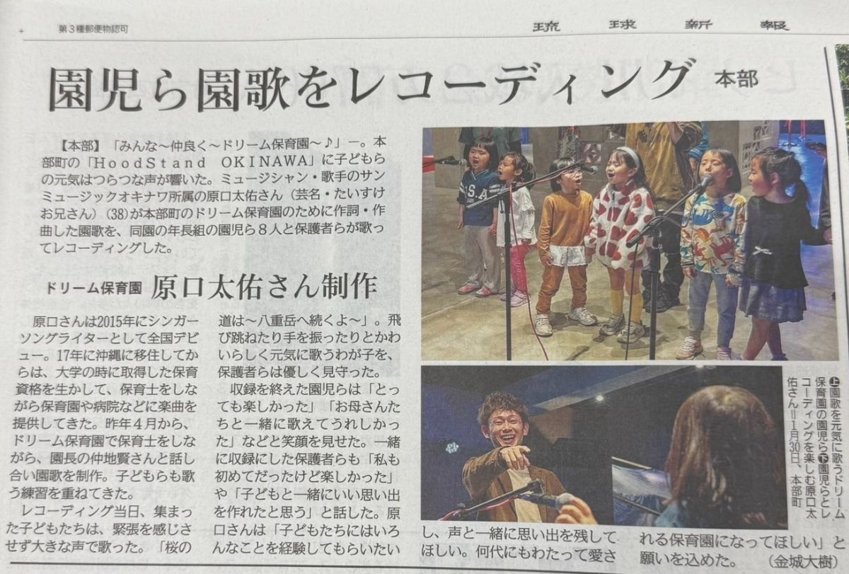 HOOD STANDにて、ミュージシャン・歌手のサンミュージックオキナワ所属の原口太佑さん(たいすけお兄さん)と子供達によるコラボ企画の様子が琉球新報に記載されました。
